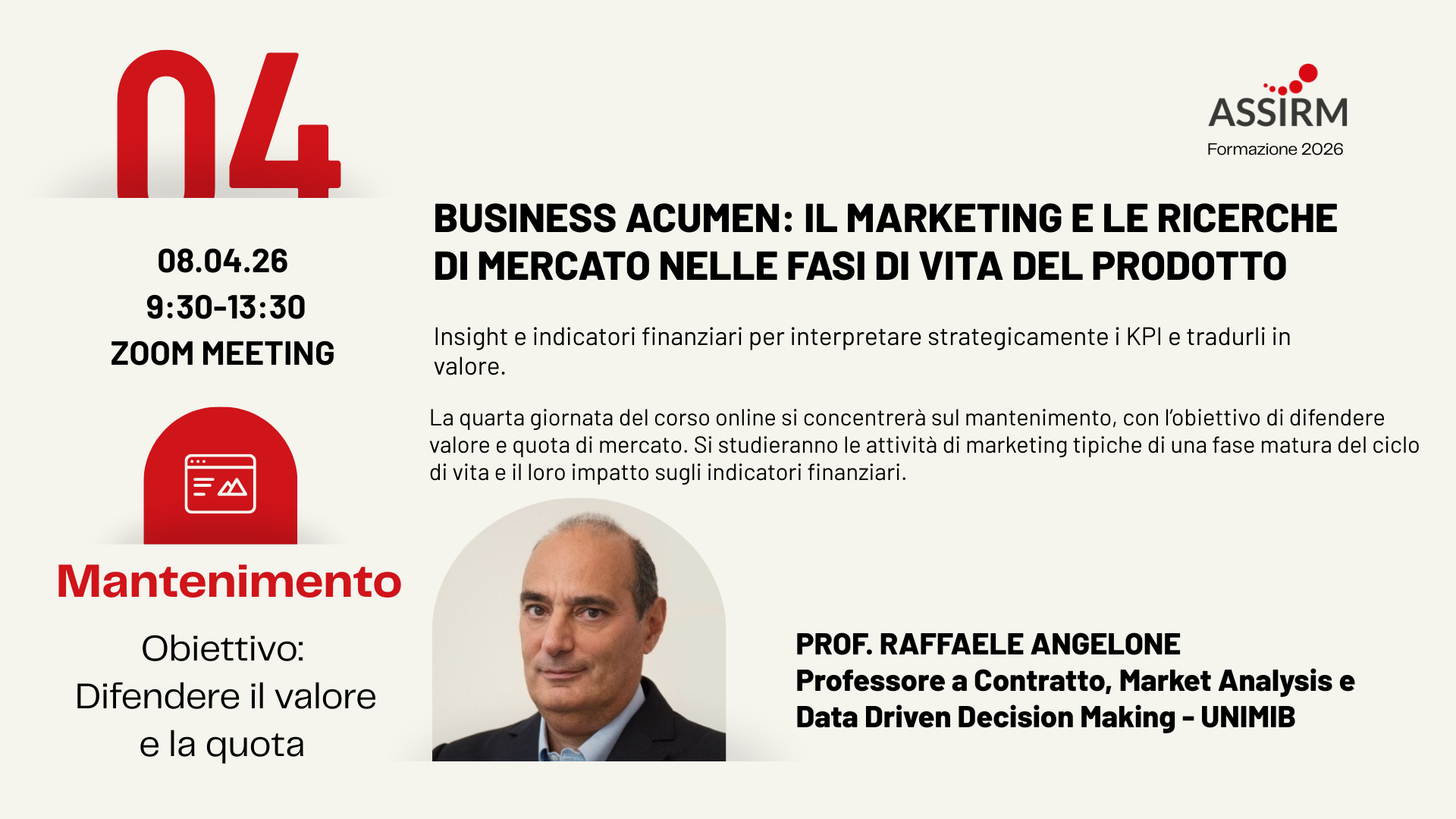 La quarta giornata del corso online si concentrerà sul mantenimento, con l’obiettivo di difendere valore e quota di mercato. Si studieranno le attività di marketing tipiche di una fase matura del ciclo di vita e il loro impatto sugli indicatori finanziari. Particolare attenzione sarà data alle informazioni utili per proteggere performance e redditività, monitorando i KPI più adatti per prevenire erosioni di quota o margine. Anche questa giornata includerà lavoro di gruppo.